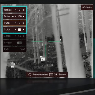 Oprócz czterech trybów wyświetlania obrazu użytkownik może skorzystać z kilku rodzajów krzyży celowniczych i podświetleń w czterech kolorach: