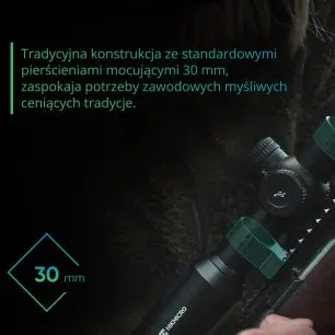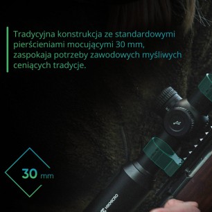 Nowa konstrukcja lunety pozwala na montaż na standardowych pierścieniach 30 mm, zapewniając łatwą obsługę, stabilność i niezawodność.